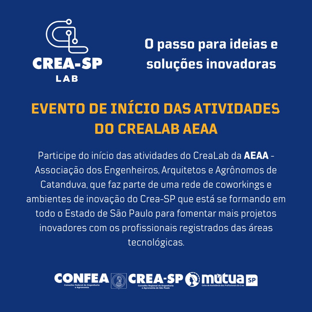 No dia 30 de outubro de 2023 teremos o evento de início das atividades da unidade do CreaLab na Associação dos Engenheiros, Arquitetos e Agrônomos de Catanduva.